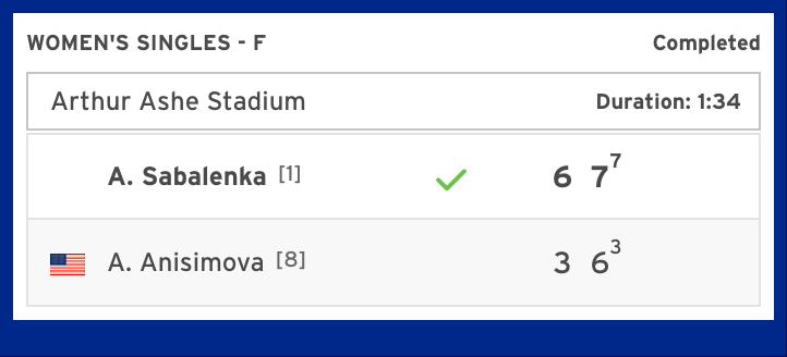 第二盘仍是萨巴伦卡率先取得破发,阿尼西莫娃化解对手的发球胜赛局把比赛拖入“抢七”。本赛季,萨巴伦卡在前21次“抢七”比拼中,仅1次失手。这次,萨巴伦卡没有给对手太多机会,一度带出5个冠军点。在阿尼西莫娃回球出界后,萨巴伦卡顺利兑现,夺得生涯第100场大满贯比赛胜利,同时也拿下第四个大满贯冠军头衔。