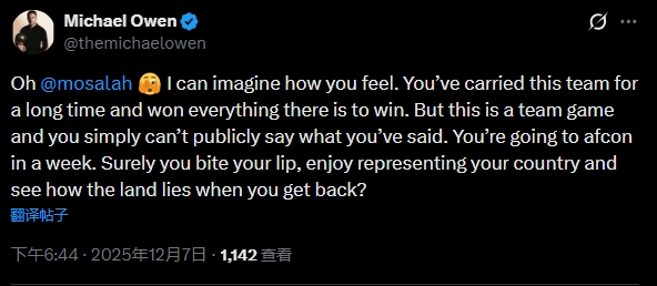 辉达娱乐直播吧12月07日讯 迈克尔欧文发社媒谈萨拉赫的言论。英超第15轮,利物浦客场3-3被绝平,萨拉赫全程替补,赛后采访引爆全网。