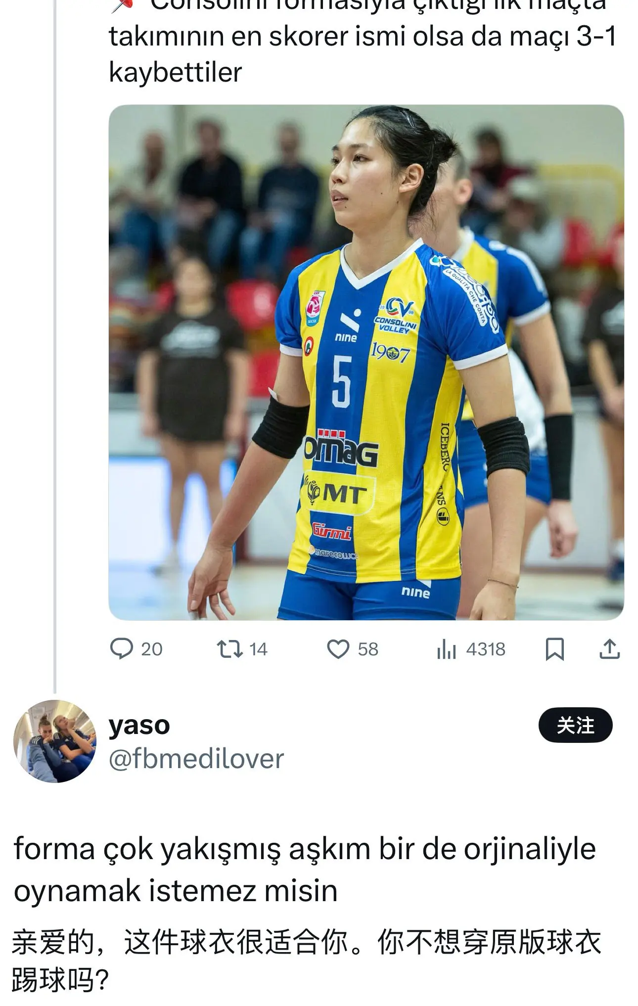 球队输掉了比赛,但庄宇珊的意甲首秀却征服了土超的球迷。因为圣乔瓦尼女排和土超的费内巴切有合作,再加上两支队伍球衣风格较为类似,活脱脱的一个“小费内巴切”,故而费内球迷直接表示“亲爱的,这件球衣很适合你,你不想穿原版球衣打球吗?”这个邀请就是对庄宇珊意甲首秀最好的评价。
